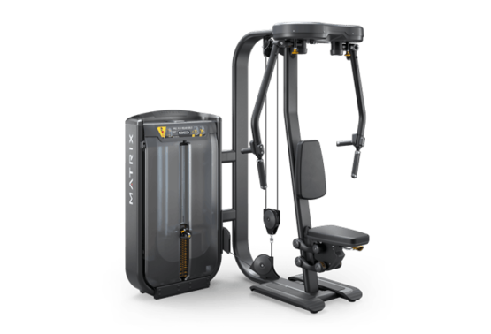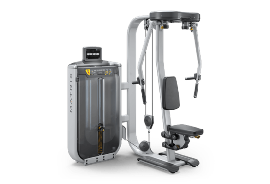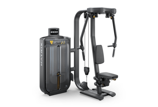 Angled back pad and delt grips enhance user comfort and improve biomechanics.